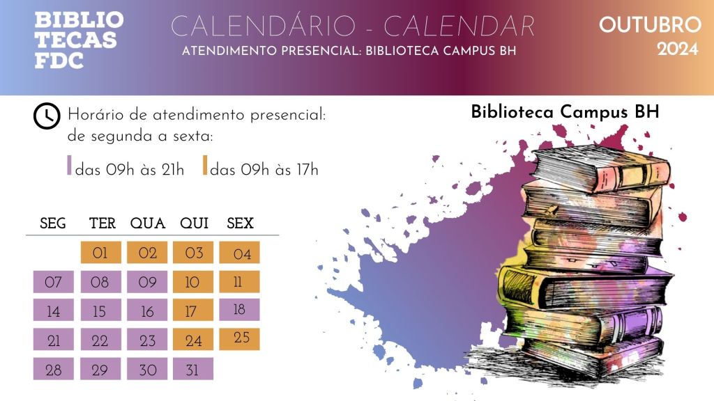Horário de Atendimento Presencial das Bibliotecas da FDC – Outubro 2024 Biblioteca Walther Moreira Salles (BWMS), em Nova Lima Biblioteca Campus BH, em Belo Horizonte