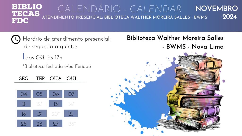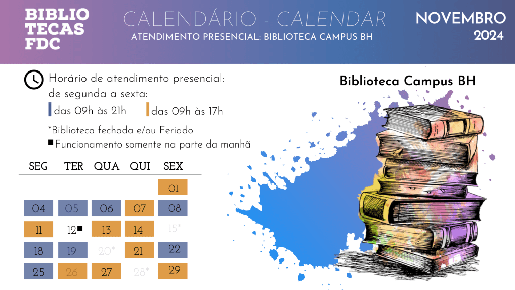 Horário de Atendimento Presencial das Bibliotecas da FDC – Novembro 2024 Biblioteca Walther Moreira Salles (BWMS), em Nova Lima Biblioteca Campus BH, em Belo Horizonte