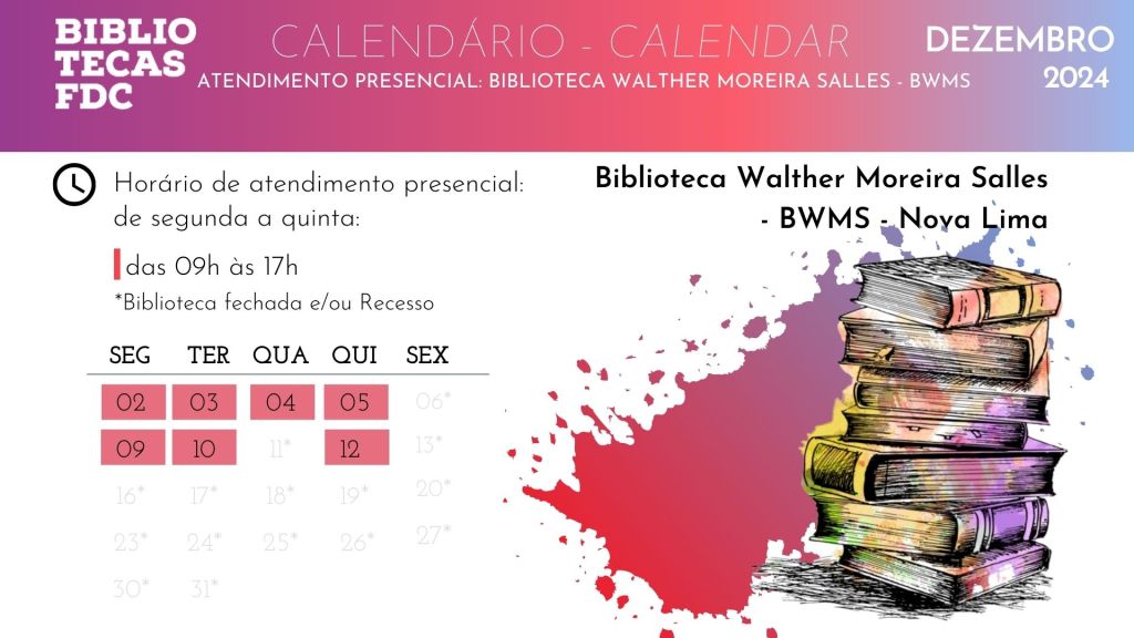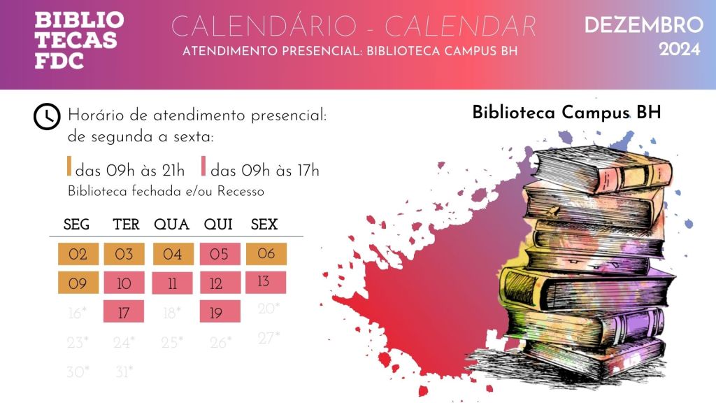 Horário de Atendimento Presencial das Bibliotecas da FDC – Dezembro 2024 Biblioteca Walther Moreira Salles (BWMS), em Nova Lima Biblioteca Campus BH, em Belo Horizonte