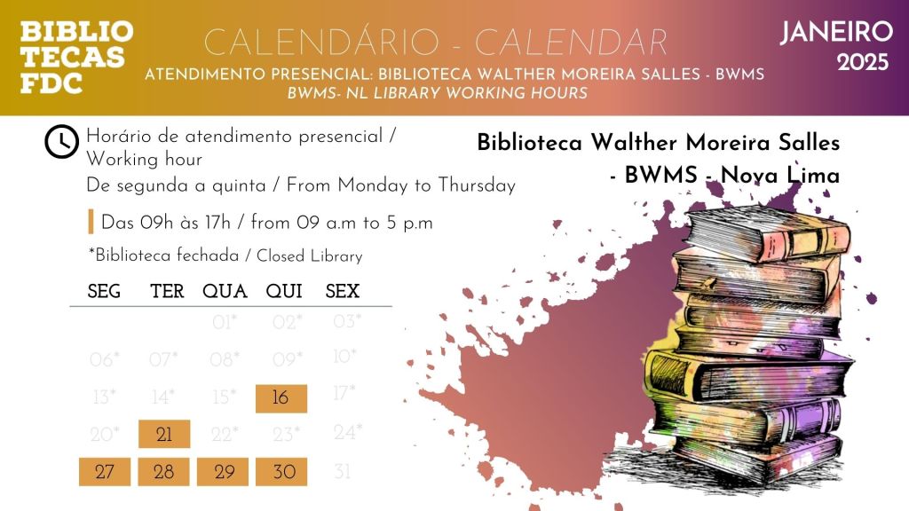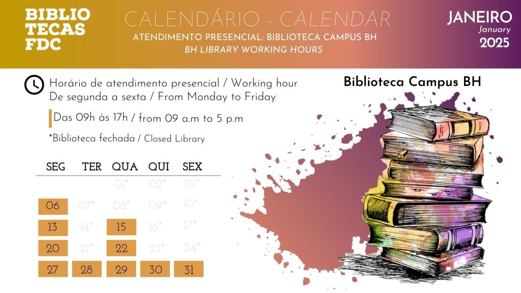 Horário de Atendimento Presencial das Bibliotecas da FDC – Janeiro 2025 Biblioteca Walther Moreira Salles (BWMS), em Nova Lima Biblioteca Campus BH, em Belo Horizonte