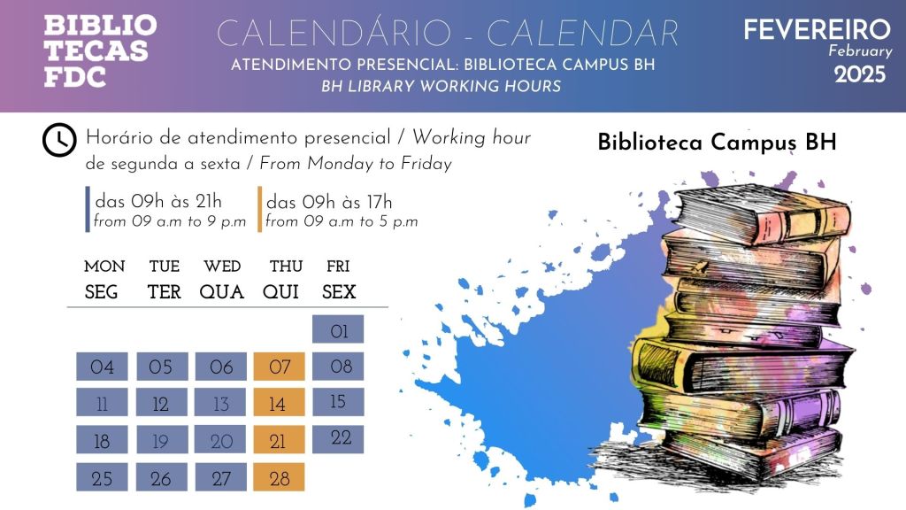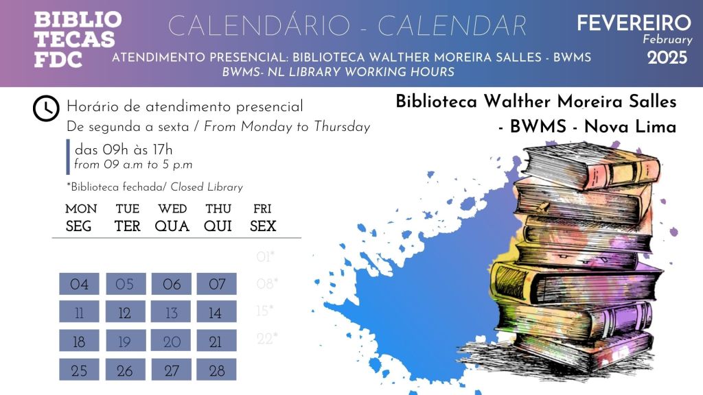 Horário de Atendimento Presencial das Bibliotecas da FDC – Fevereiro 2025 Biblioteca Walther Moreira Salles (BWMS), em Nova Lima Biblioteca Campus BH, em Belo Horizonte