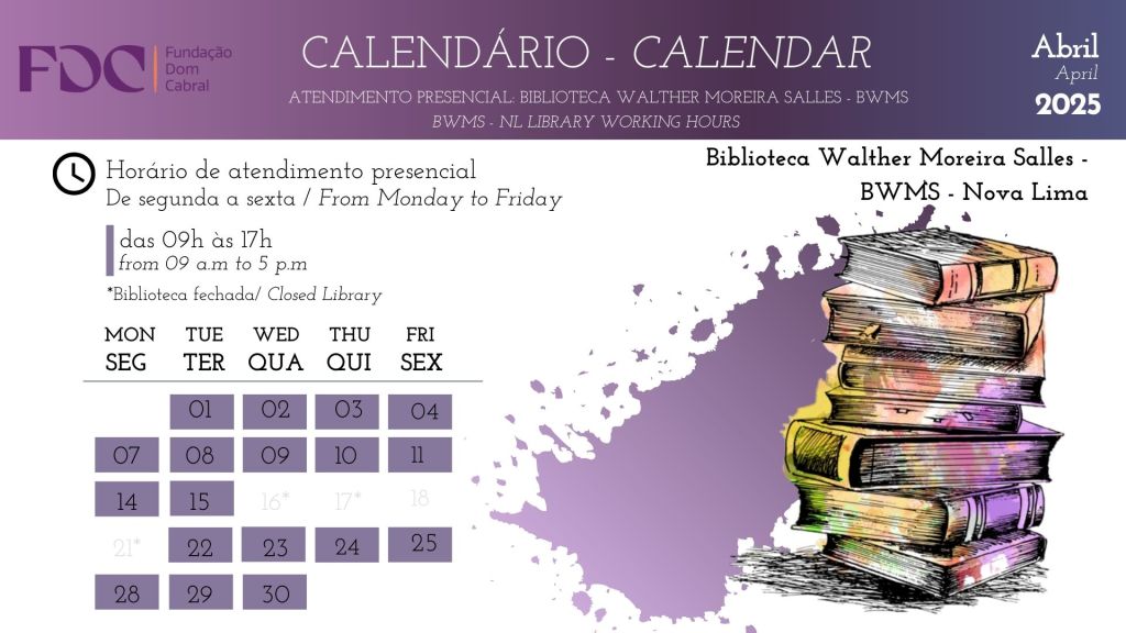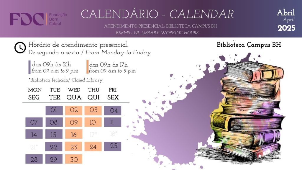 Horário de Atendimento Presencial das Bibliotecas da FDC – Abril 2025 Biblioteca Walther Moreira Salles (BWMS), em Nova Lima Biblioteca Campus BH, em Belo Horizonte