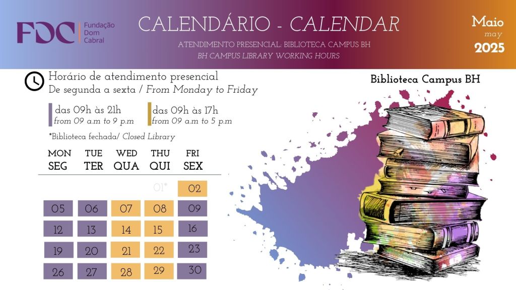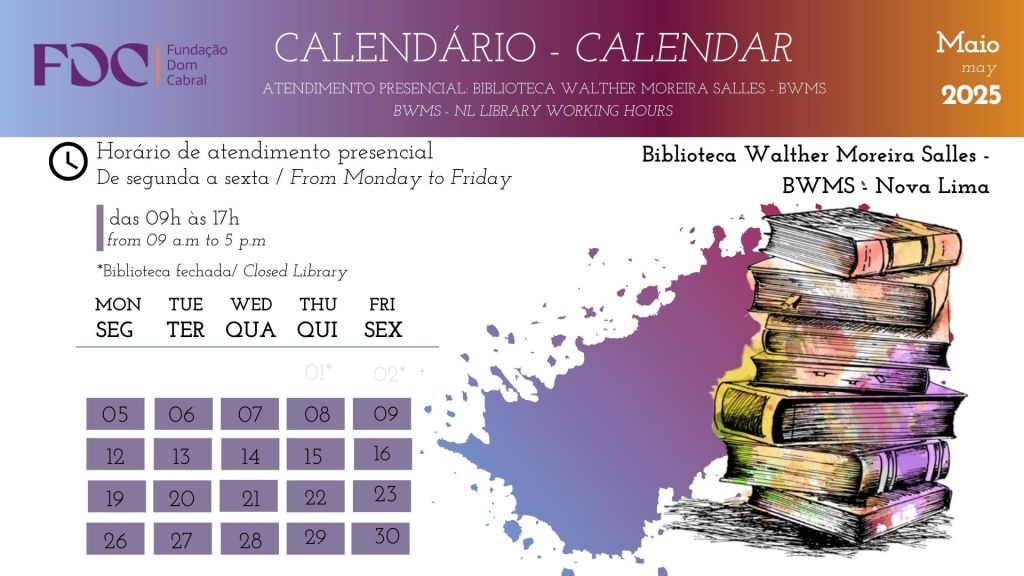 Horário de Atendimento Presencial das Bibliotecas da FDC – Maio 2025 Biblioteca Walther Moreira Salles (BWMS), em Nova Lima Biblioteca Campus BH, em Belo Horizonte