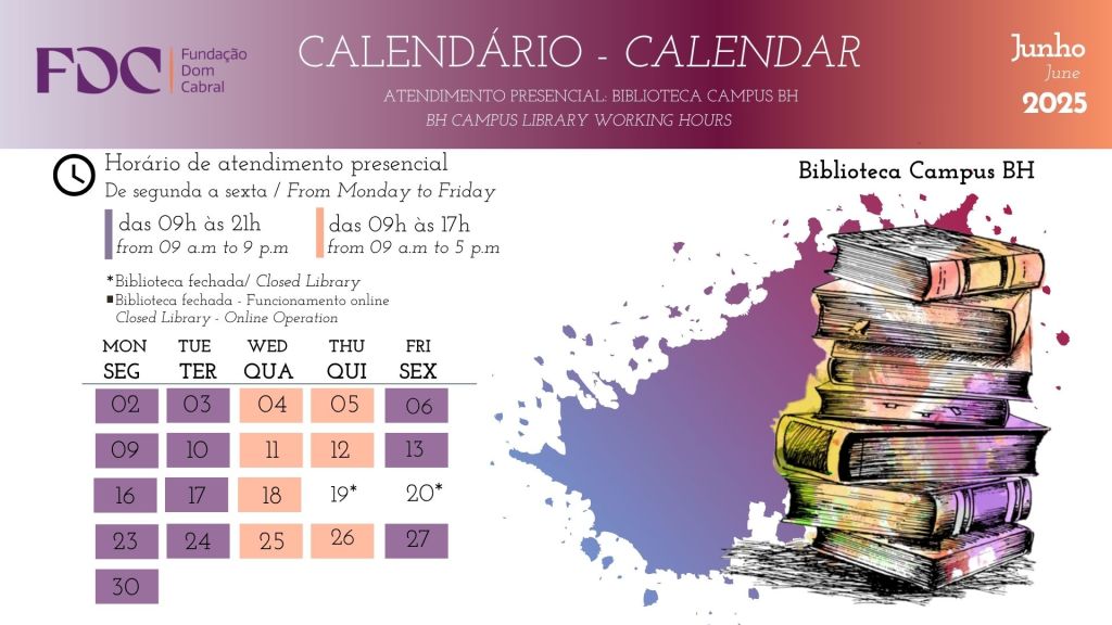 Horário de Atendimento Presencial das Bibliotecas da FDC – Junho 2025 Biblioteca Walther Moreira Salles (BWMS), em Nova Lima Biblioteca Campus BH, em Belo Horizonte