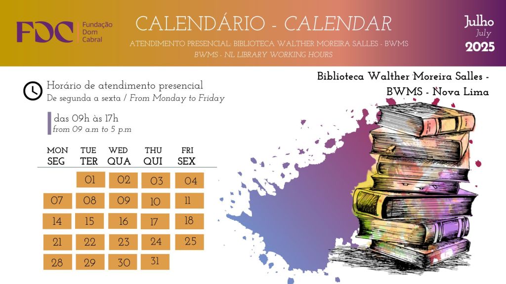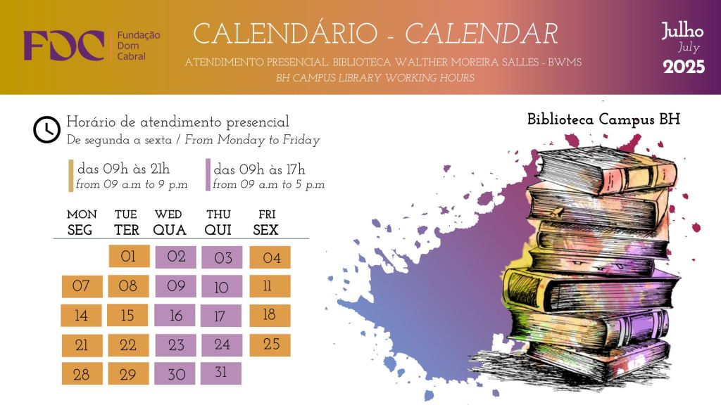 Horário de Atendimento Presencial das Bibliotecas da FDC – Julho 2025 Biblioteca Walther Moreira Salles (BWMS), em Nova Lima Biblioteca Campus BH, em Belo Horizonte
