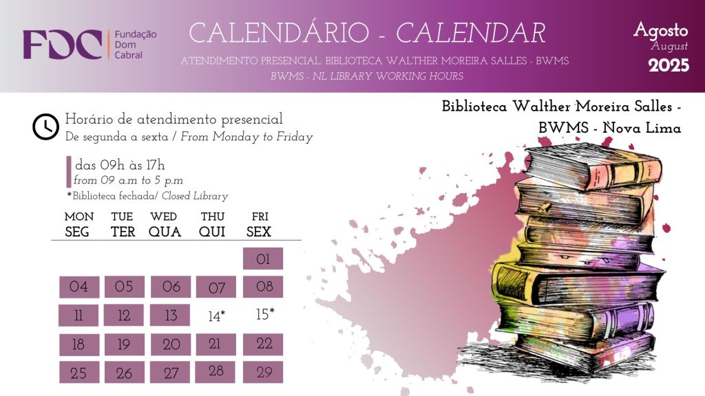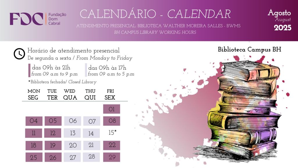 Horário de Atendimento Presencial das Bibliotecas da FDC – Agosto 2025 Biblioteca Walther Moreira Salles (BWMS), em Nova Lima Biblioteca Campus BH, em Belo Horizonte